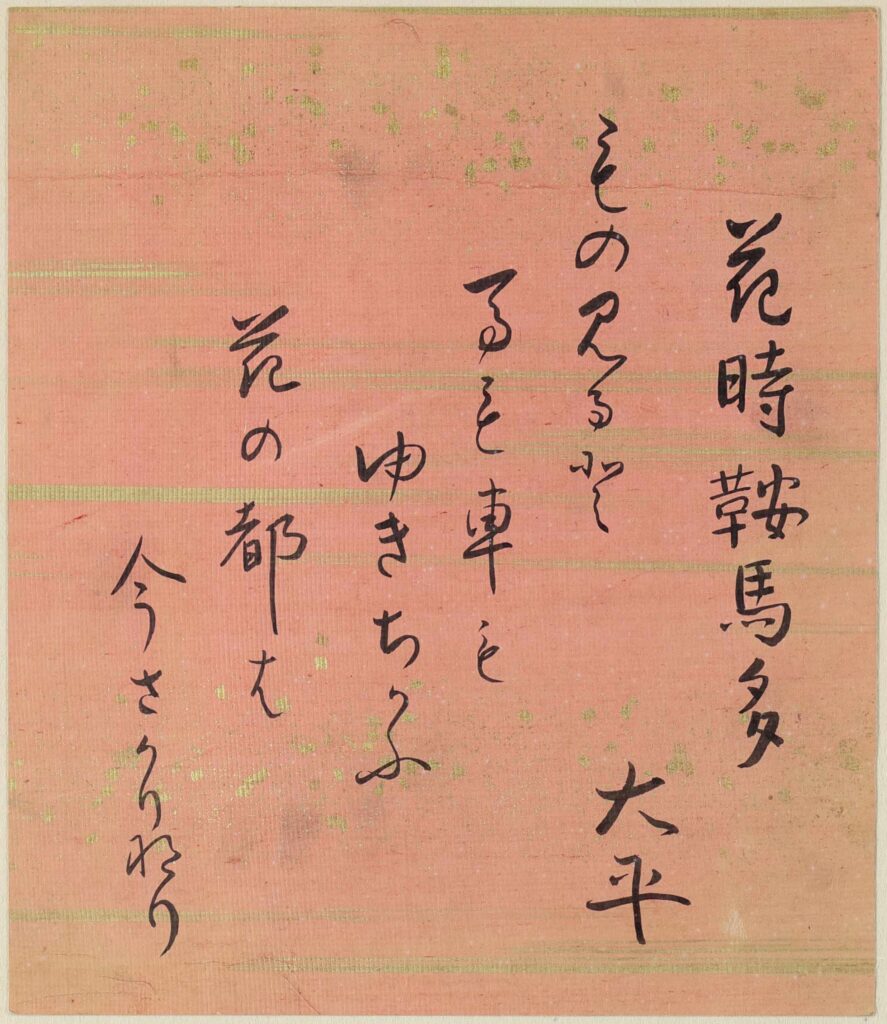 色紙 本居大平(本居三四右衛門・本居藤垣内)手鑑2和歌 本居大平 和歌(狂歌?)色紙 色紙 2024.05.29 撮影:四国大学 / 分類:手鑑2-44-3 花時鞍馬多もの見ると馬も車もゆきちかふ花の都は今さかりなり 大平 気づき ○実に平凡。