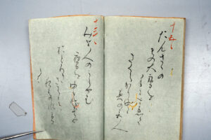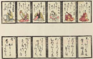 【鑑賞】「狩り」は「狩り」でもこれは「桜狩り」。手には「大きい鷹」ならぬ「大高檀紙」の短冊を据えて(持って)「狩り」をつづけているのである。同音異義語をたくみに使い、雅な宮廷人の春の遊びを詠んだところ、秀逸。この歌が載せられている『春足狂歌百首』(題簽なし。書名は筆者が仮題として勝手につけたもの。)には六樹園(宿屋飯盛)の点掛け(採点)があり、この歌には上位から三番目の十五という高点が掛けられている。