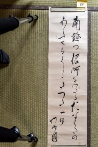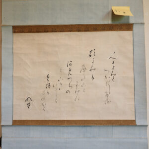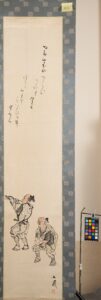 【鑑賞】三河万歳は正月ごろ二、三人が一組となって各家庭をまわり目出度い文句を歌って新春を言寿ぐ芸能の一種である。従って「お目出度い」もの。遠藤家では正月になるとこの掛け軸を床の間に掛ける習わしがあったそうだ。三河万歳、鼓、初音、に鶯の初音を重ねたところが秀逸。